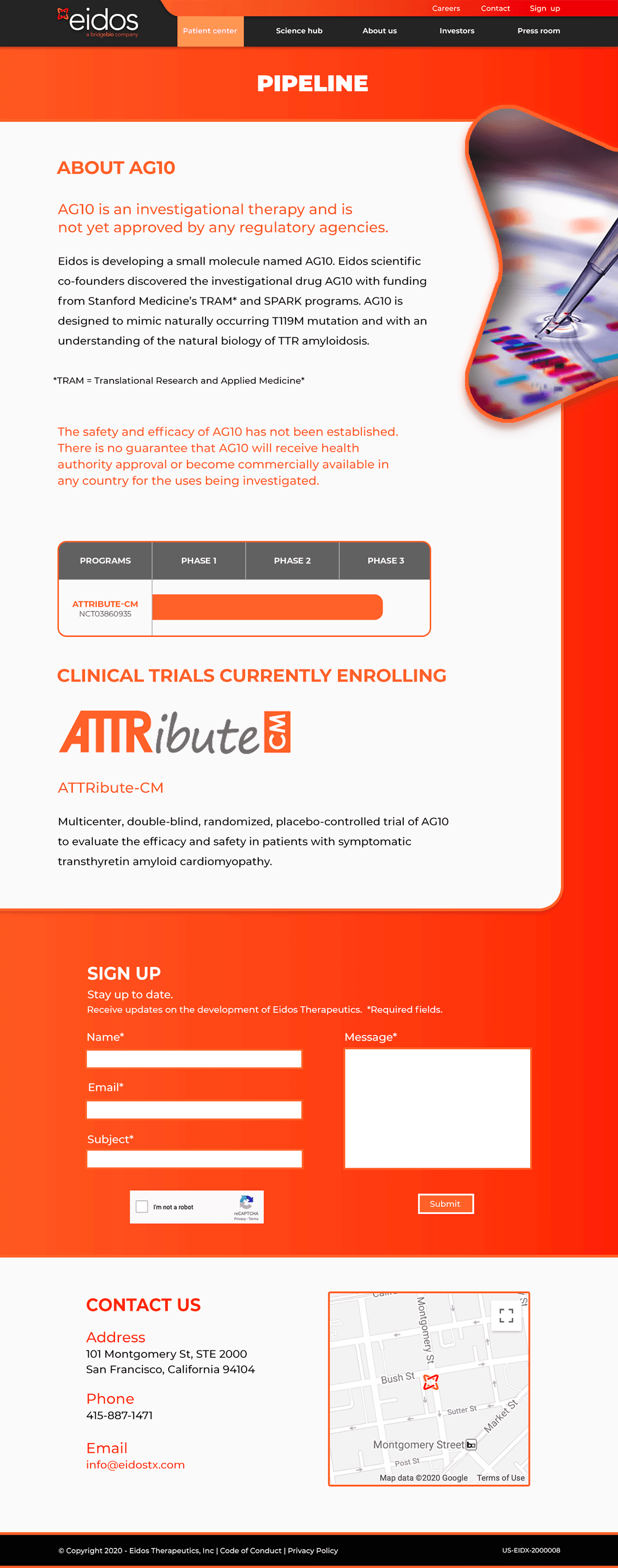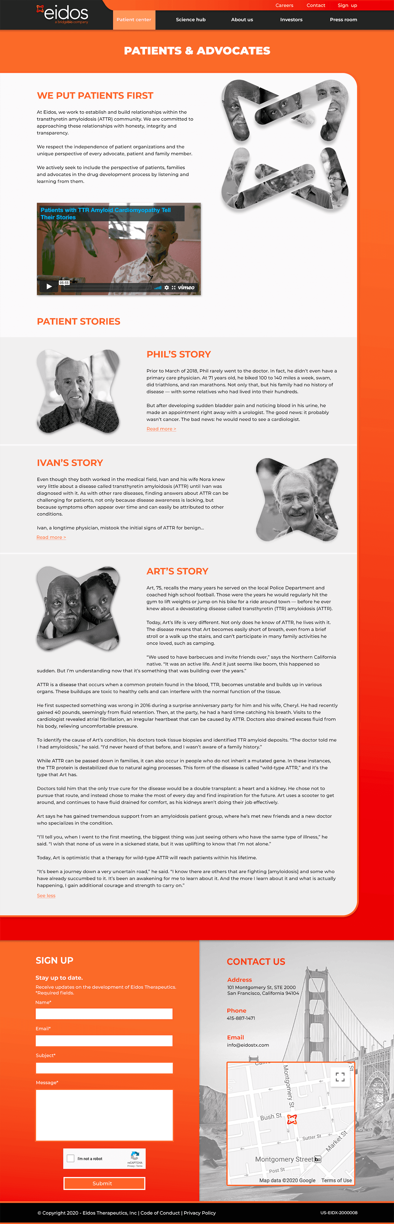 Eidos, a medication targeting amyloid transthyretin cardiomyopathy (ATTR-cm) that causes heart failure in adults, came to us to design an informative website to communicate ATTR-cm complexities to patients. We also designed print materials and a conventional booth for Eidos’ debut in 2020.